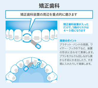 このマルチブラケット装置が付くと、歯磨き方法や歯ブラシの形、歯みがき剤も、それらに合わせて選んでブラッシングしていただく方がキレイにみがけます。そのために、当院の歯科衛生士がお一人お一人に指導させていただきます。