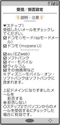 ステップ1では、携帯電話・PHSなどからのメールの受信/拒否、および、なりすましメールの設定ができます。