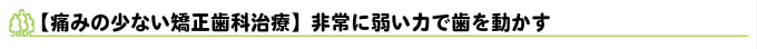 そこで当院の矯正歯科治療では、できるだけ非常に弱い力をかけるところからスタート。痛みがなるべく出ないように、やさしい力で歯を動かします。また、やさしい力で"じわじわ"と歯を動かせる最新のワイヤーを積極的に導入することで、患者さんが快適に矯正歯科治療ライフを過ごせるよう心がけています。